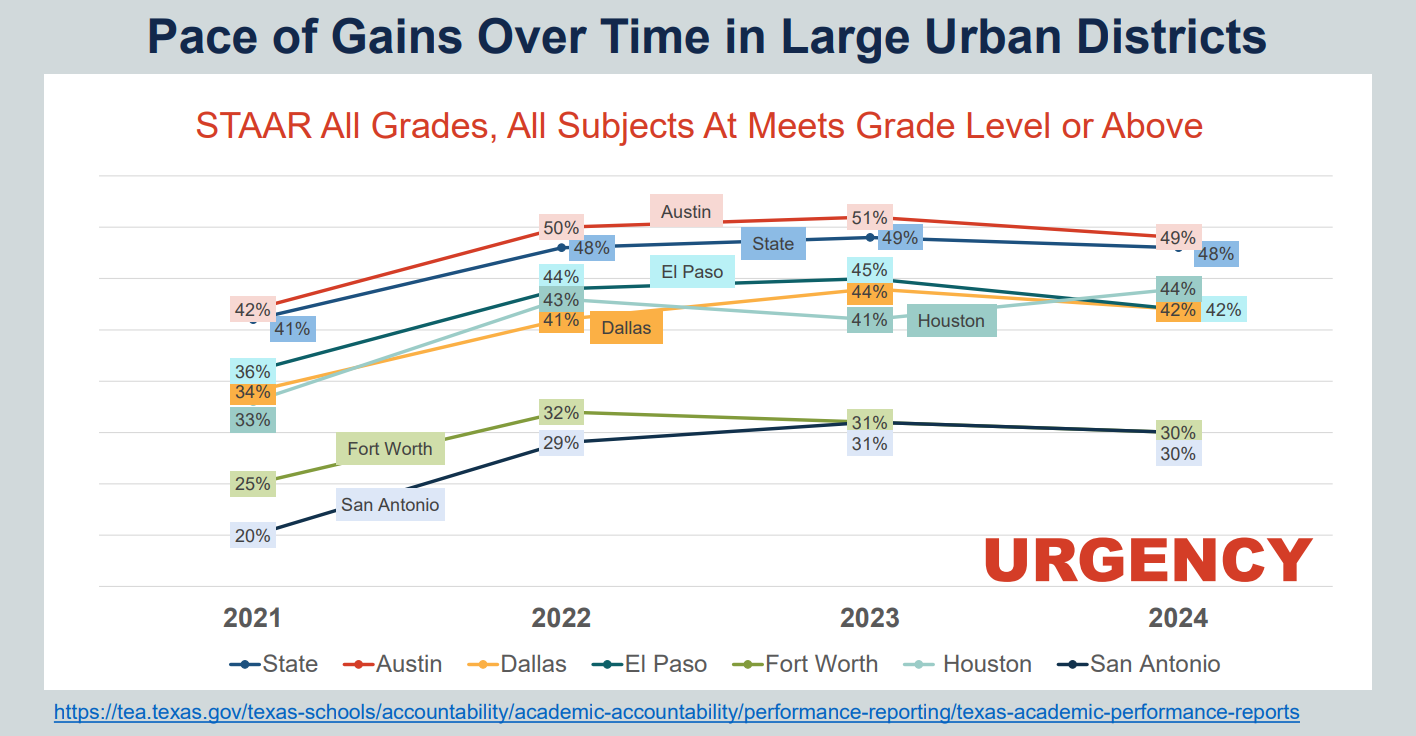 “The current state of academic achievement for the District has been stagnant, below state average and significantly below urban Texas peer districts.”